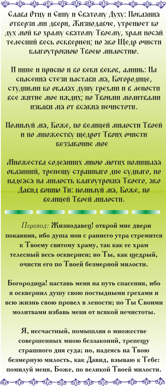 Это единственное песнопение, которое объединяет период подготовки к Великому посту и сам Пост. Оно появляется с началом пения Постной Триоди в Неделю о мытаре и фарисее. Мы слышим его на каждой воскресной всенощной (вечернее богослужение в субботу вечером) вплоть до пятого Воскресения Великого поста, или Недели о преподобной Марии Египетской. Евангельское чтение этого дня предлагает для поучения притчу Христа о мытаре и фарисее (Лк. 18:10-14), от названия этой притчи получила название и первая подготовительная неделя. Эта притча задает тон на весь Пост.